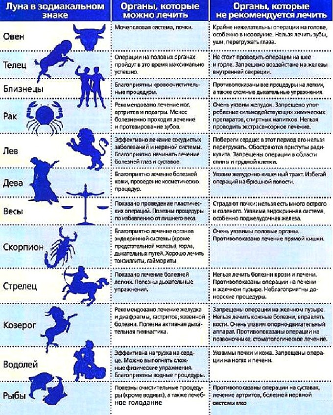 Дева | Луна убывает | На коже, пластические, косметические операции, мероприятия по очищению крови | В области брюшной полости, двенадцатиперстной кишки, нижней доли печени, желчного и мочевого пузыря, селезенки, желудка, кишечного тракта, толстого и тонкого кишечника, поджелудочной железы, почках, системы кровообращения Нельзя удалять аппендицит, делать колонотерапию |