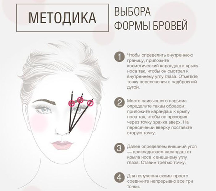 - Для начала необходимо будет визуально определить желаемую форму брови. Далее избавляемся от нежелательных волосков вне этой формы. Прикладываем карандаш к ноздре и смотрим, где он пересекается с бровью – это и будет ее начало. Чтобы узнать, где заканчивается бровь, необходимо также провести прямую линию от ноздри до внешнего уголка глаза